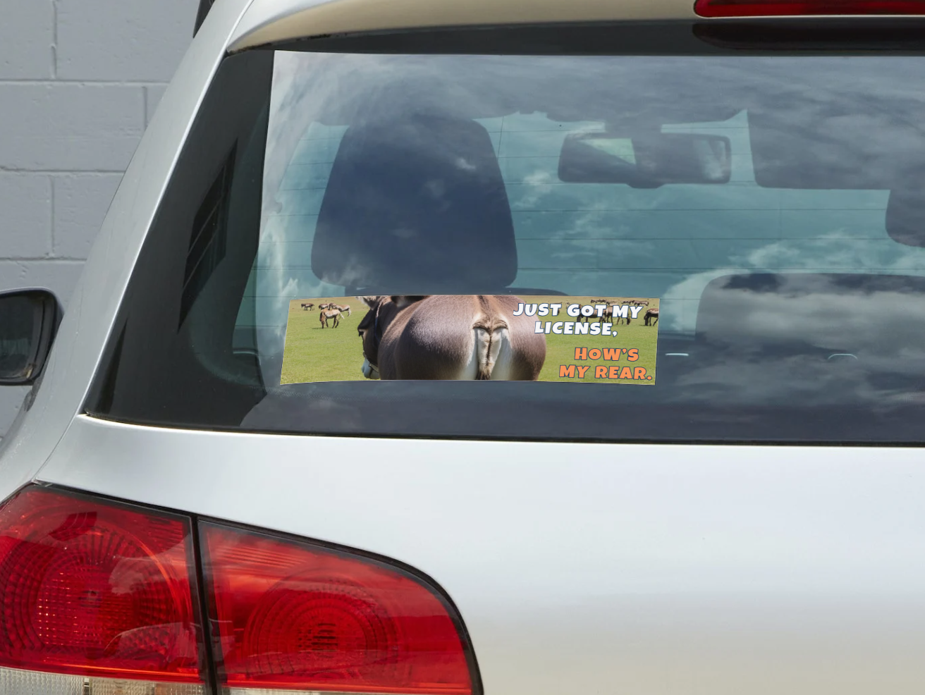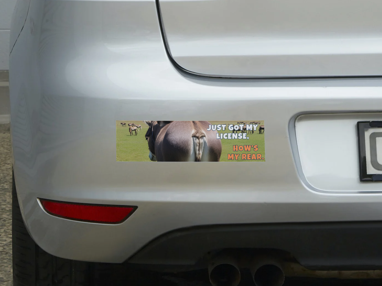 Funny New Driver Bumper Sticker 7 – "Just Got My License, How's My Rear?" – Teen Driver Gift, Car Decal, Graduation Humor Sticker