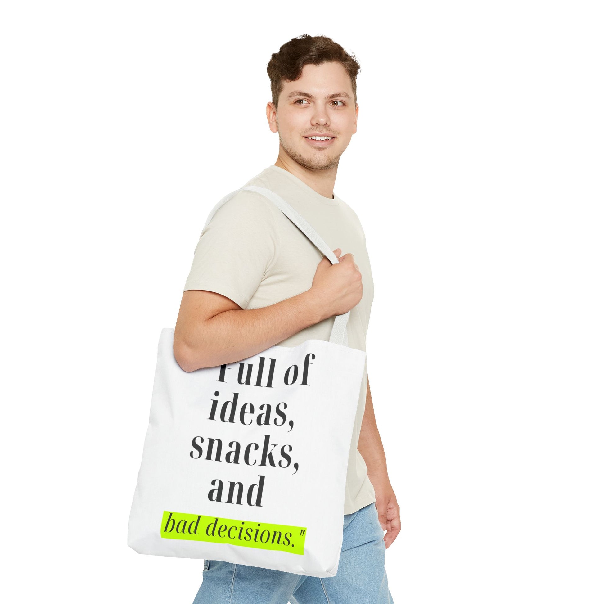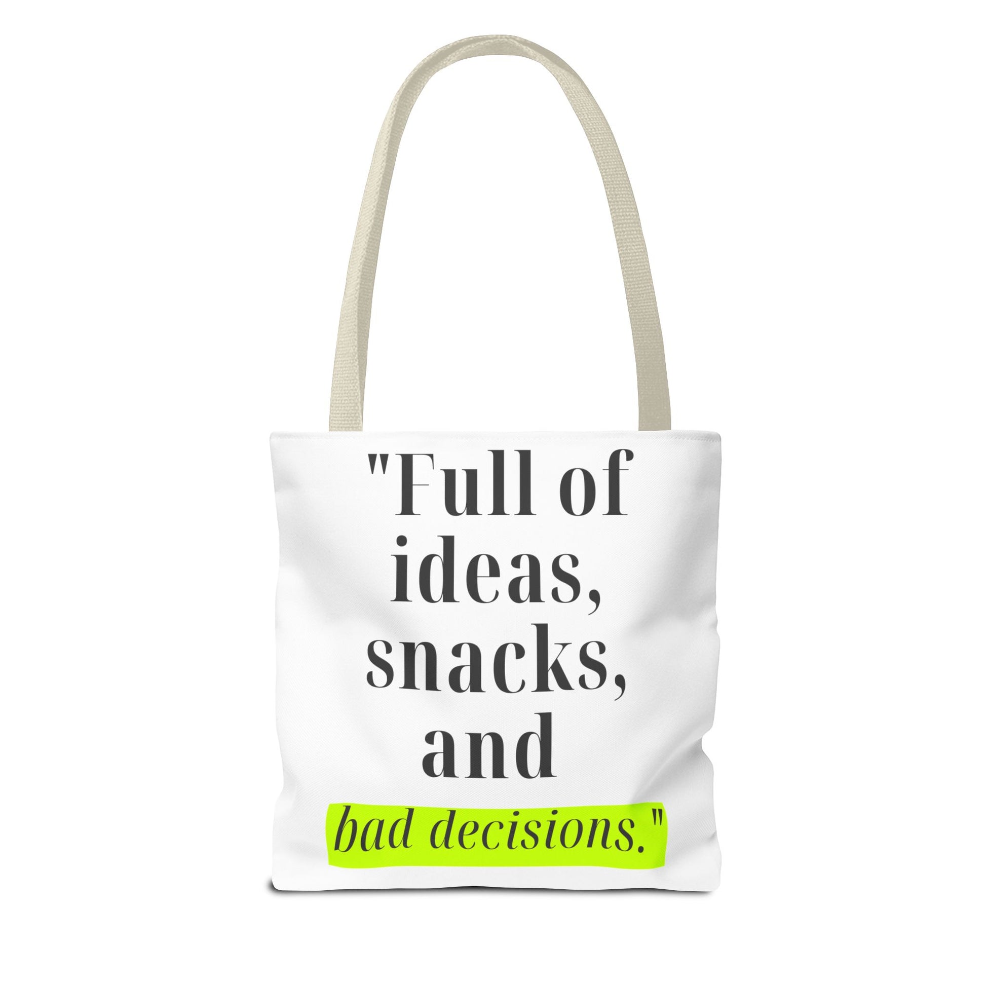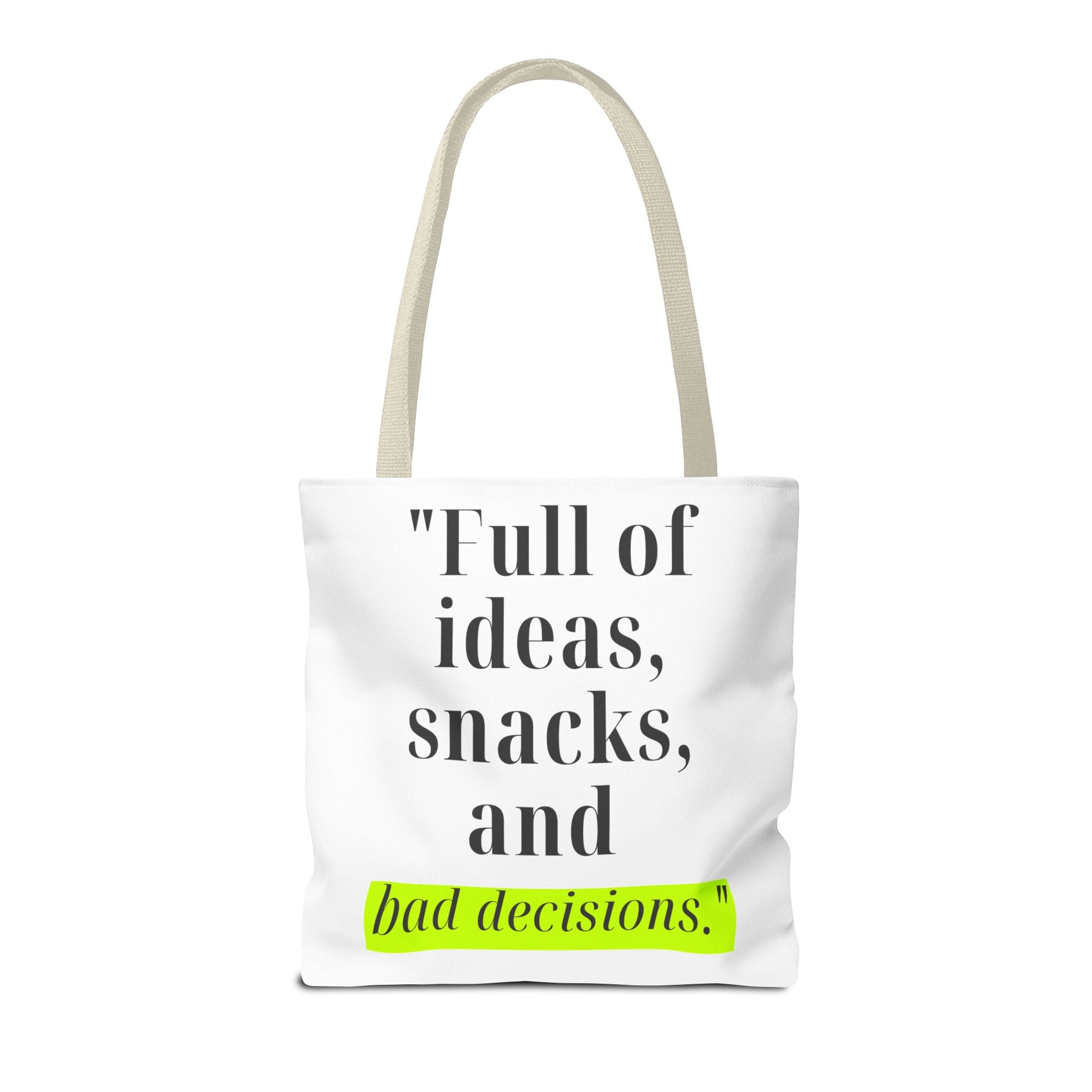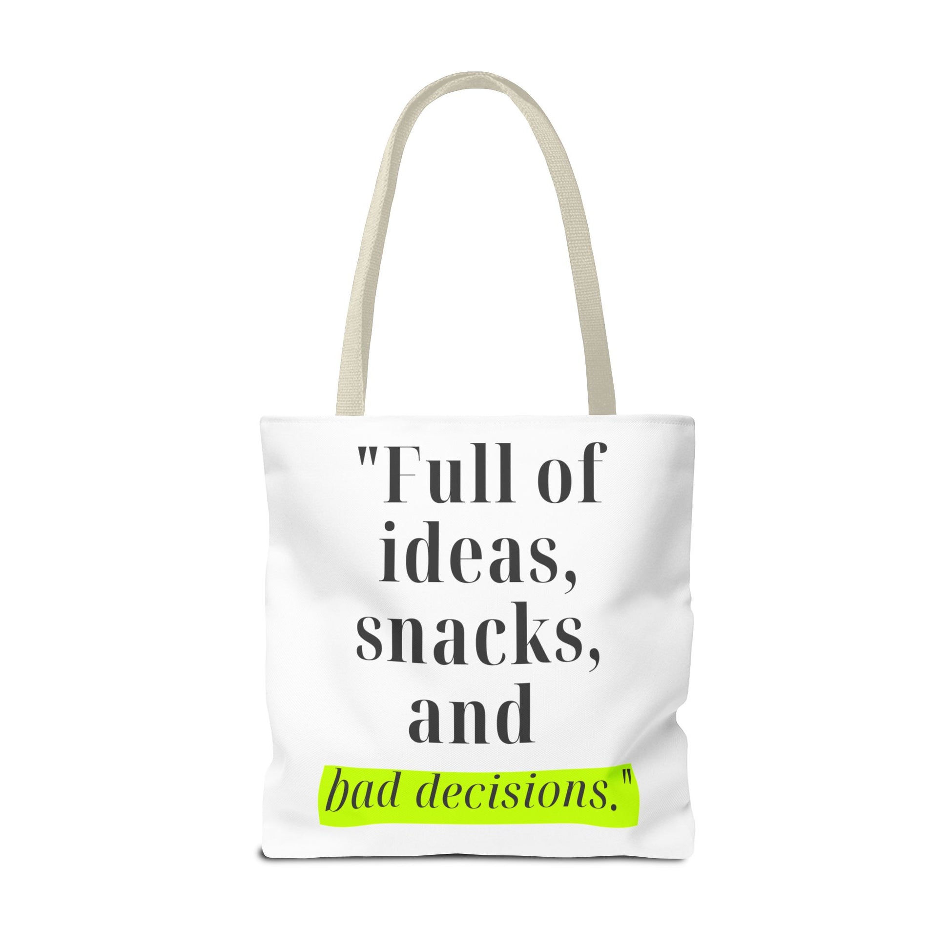 Introducing our stylish Tote Bag, perfect for the modern individual who embraces their creativity and spontaneity. With its playful design featuring the phrase "Full of ideas, snacks, and bad decisions," this bag effortlessly adds a dash of humor and personality to your outfit. Whether you're heading to a coffee shop, running errands, or heading to a beach day, this tote makes a cheerful and functional statement. It's ideal for students, busy professionals, or anyone who appreciates a blend of style and practicality. Perfect for birthdays, graduations, or just because, this tote bag will surely be a hit among friends and family!