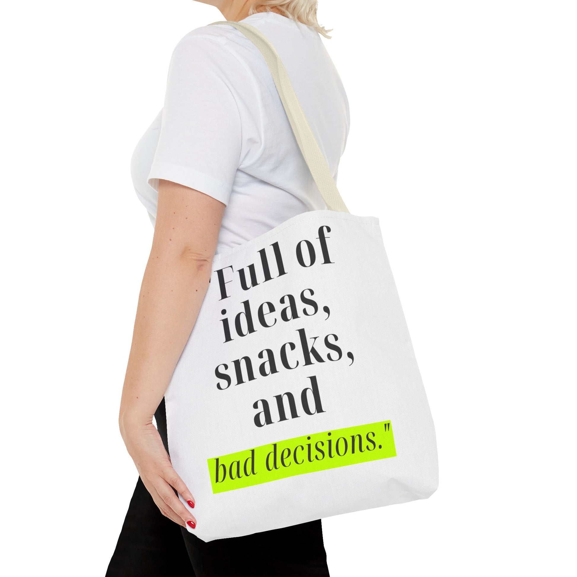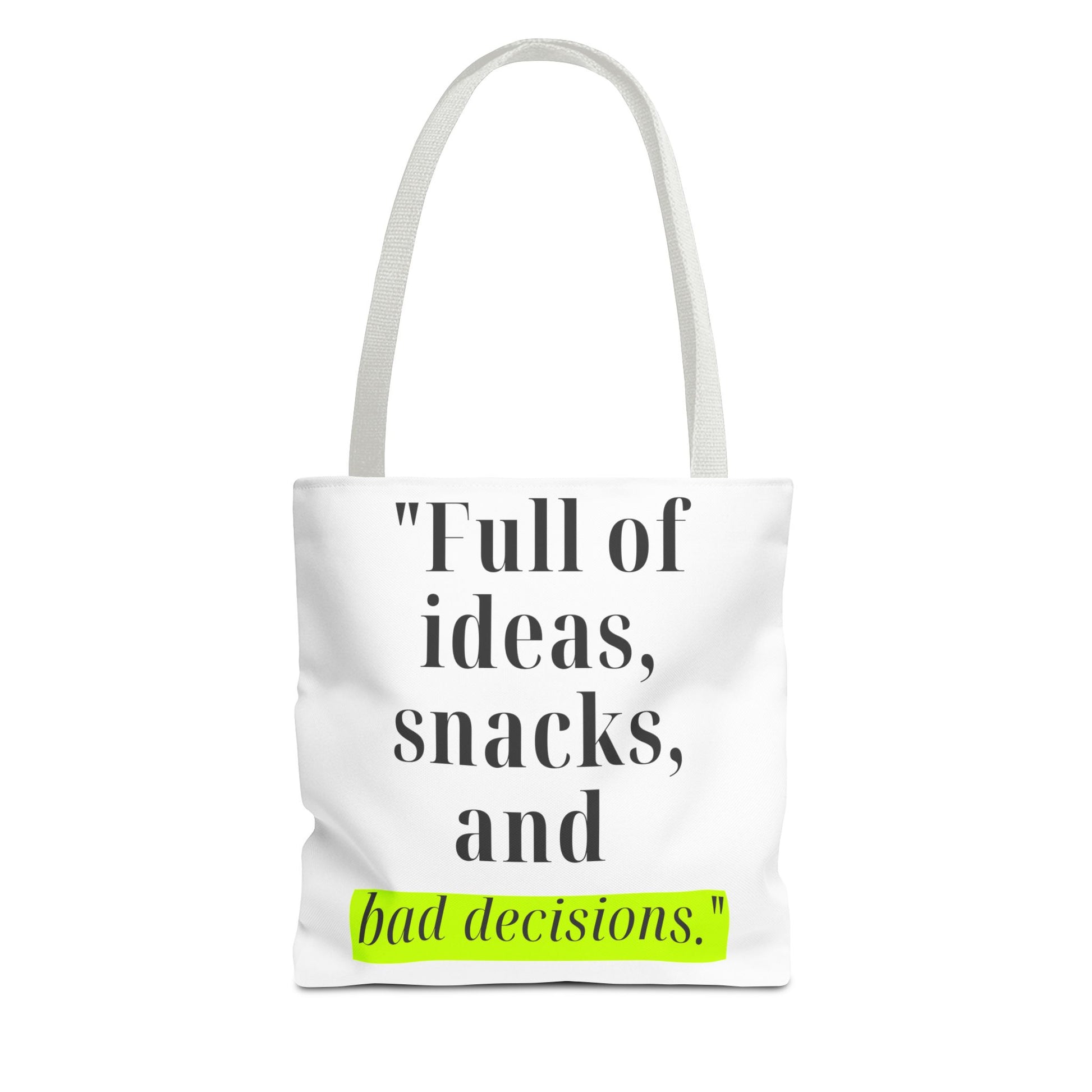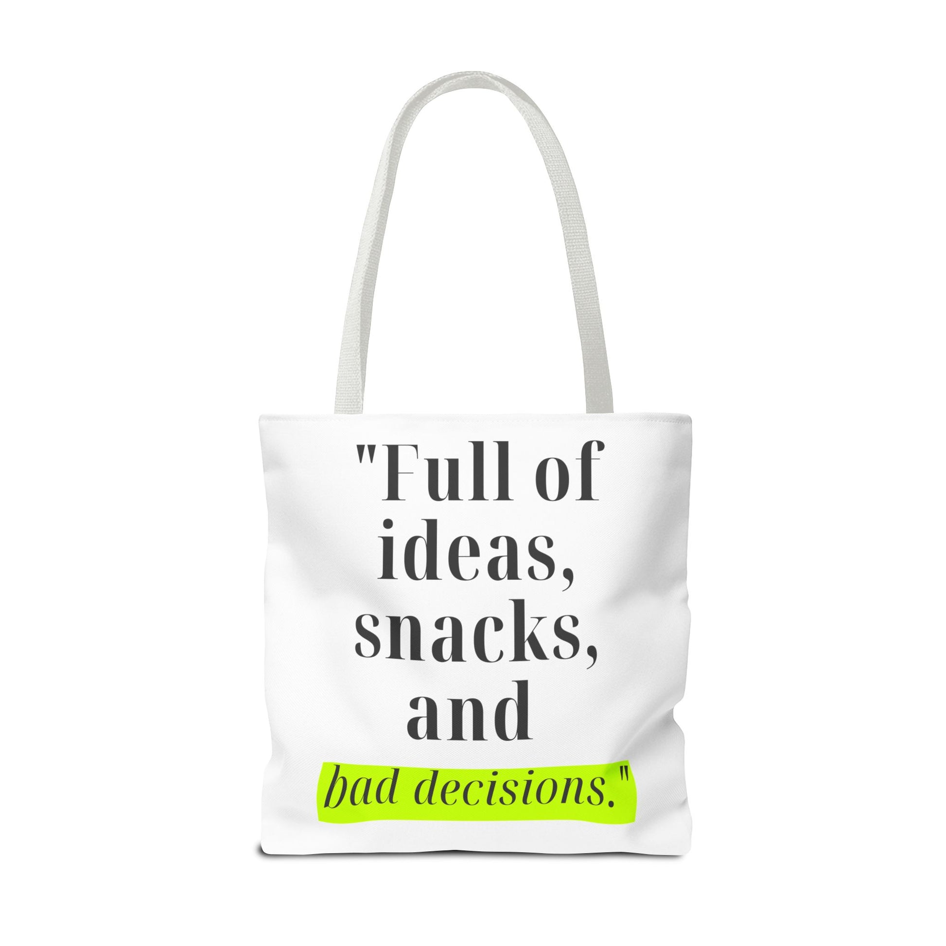 Introducing our stylish Tote Bag, perfect for the modern individual who embraces their creativity and spontaneity. With its playful design featuring the phrase "Full of ideas, snacks, and bad decisions," this bag effortlessly adds a dash of humor and personality to your outfit. Whether you're heading to a coffee shop, running errands, or heading to a beach day, this tote makes a cheerful and functional statement. It's ideal for students, busy professionals, or anyone who appreciates a blend of style and practicality. Perfect for birthdays, graduations, or just because, this tote bag will surely be a hit among friends and family!