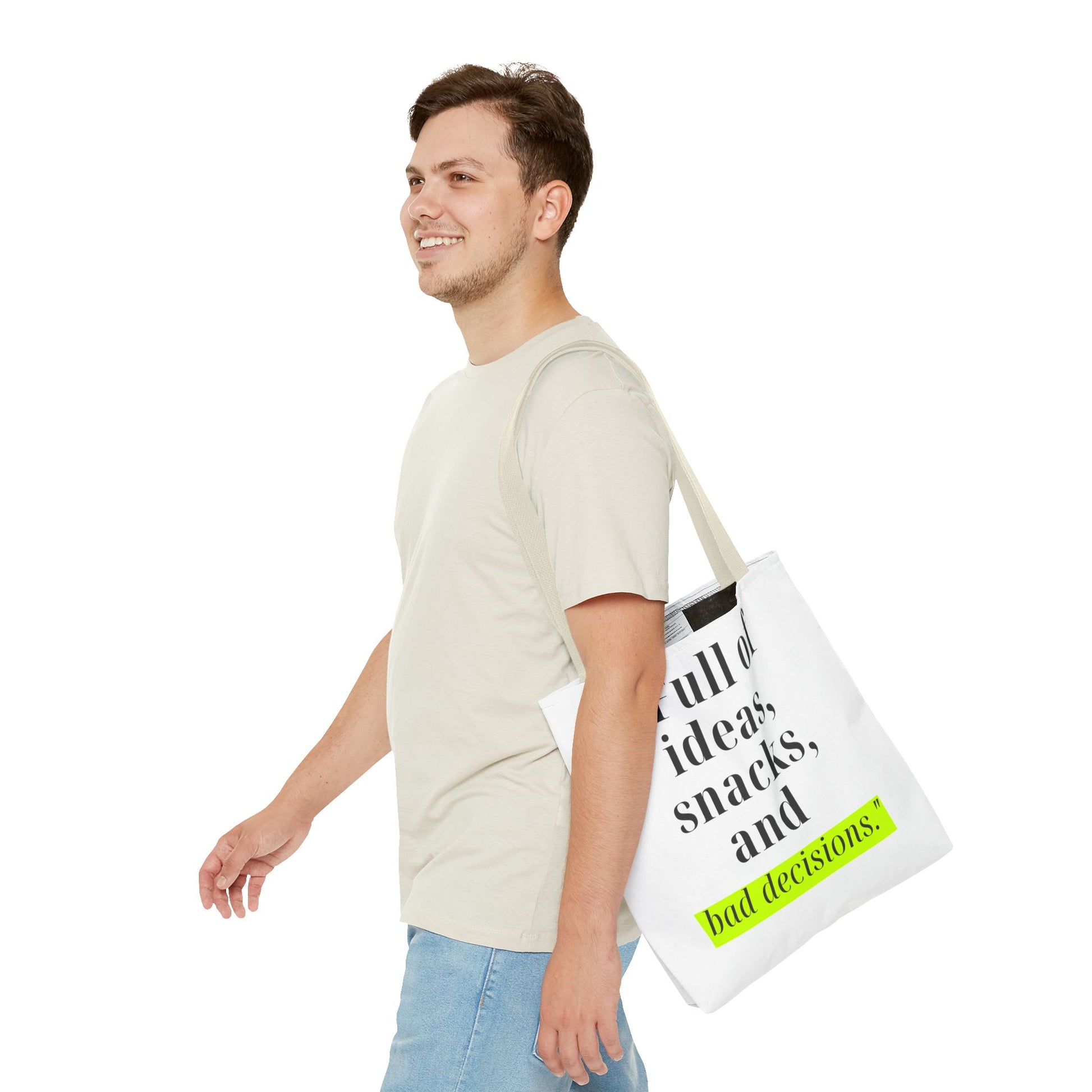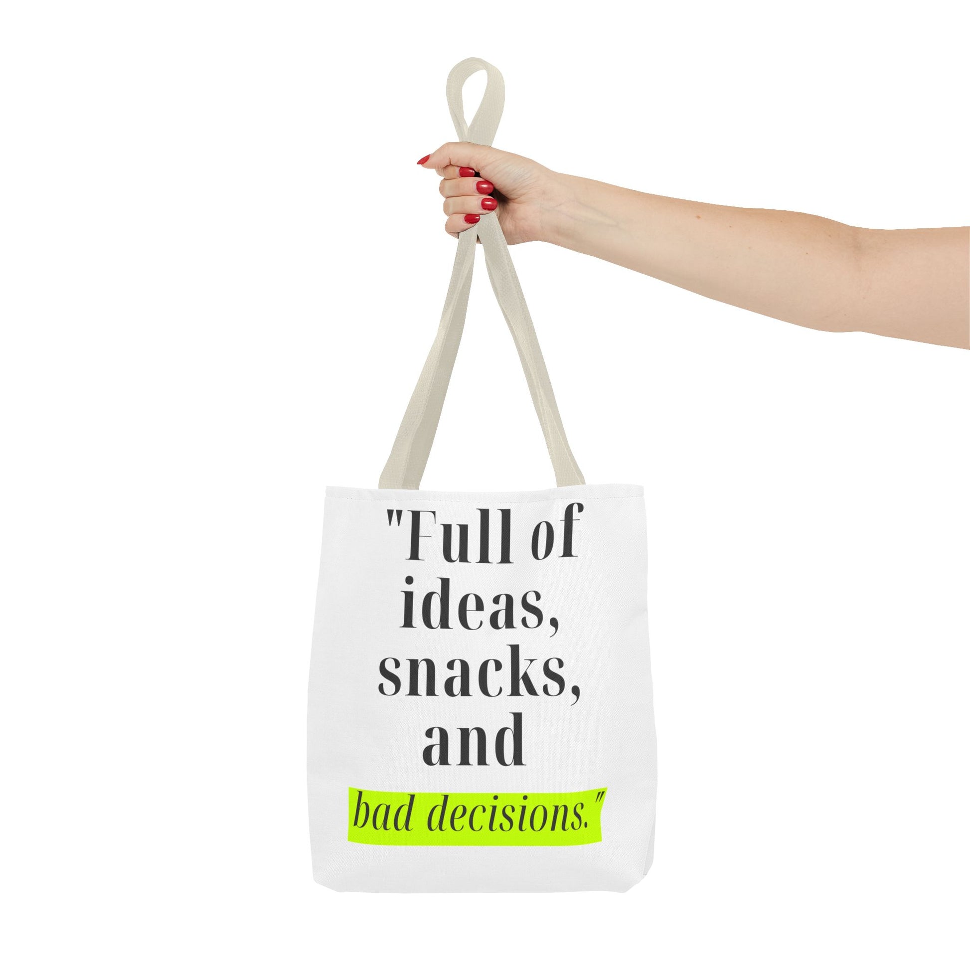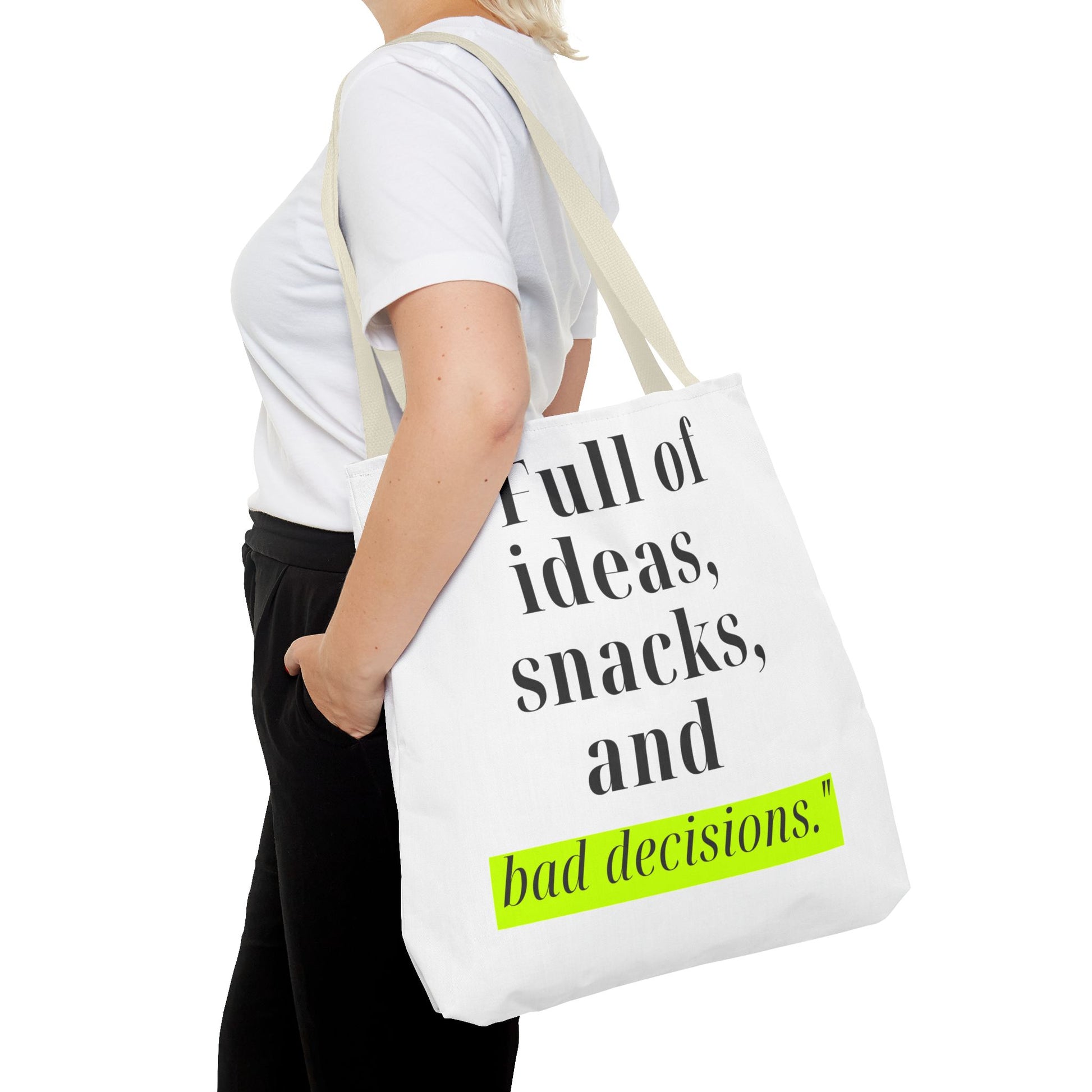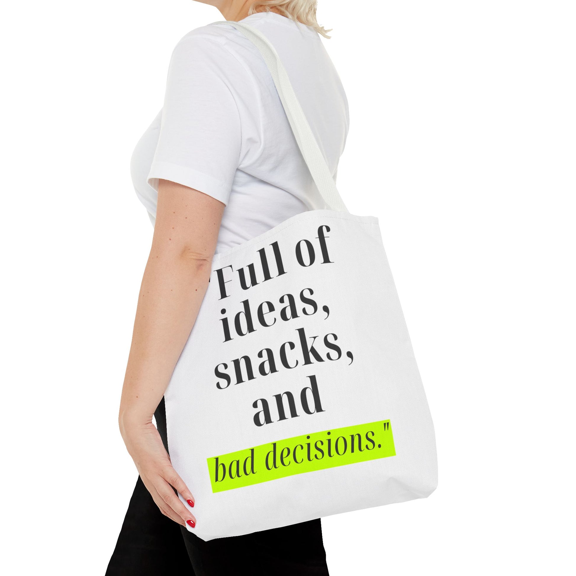 Introducing our stylish Tote Bag, perfect for the modern individual who embraces their creativity and spontaneity. With its playful design featuring the phrase "Full of ideas, snacks, and bad decisions," this bag effortlessly adds a dash of humor and personality to your outfit. Whether you're heading to a coffee shop, running errands, or heading to a beach day, this tote makes a cheerful and functional statement. It's ideal for students, busy professionals, or anyone who appreciates a blend of style and practicality. Perfect for birthdays, graduations, or just because, this tote bag will surely be a hit among friends and family!