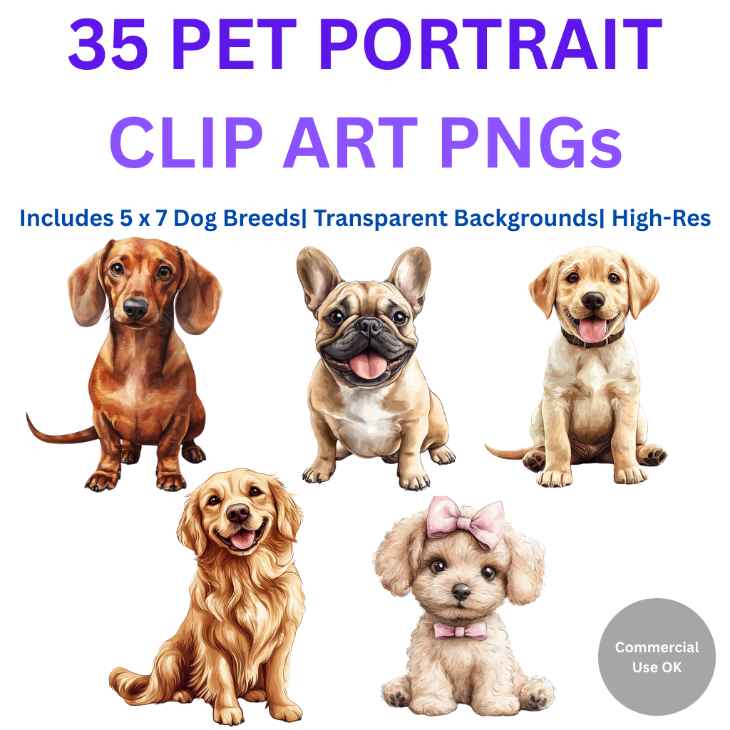 This bundle includes five high-resolution png images, featuring beautifully illustrated portraits of your favourite dog breeds: