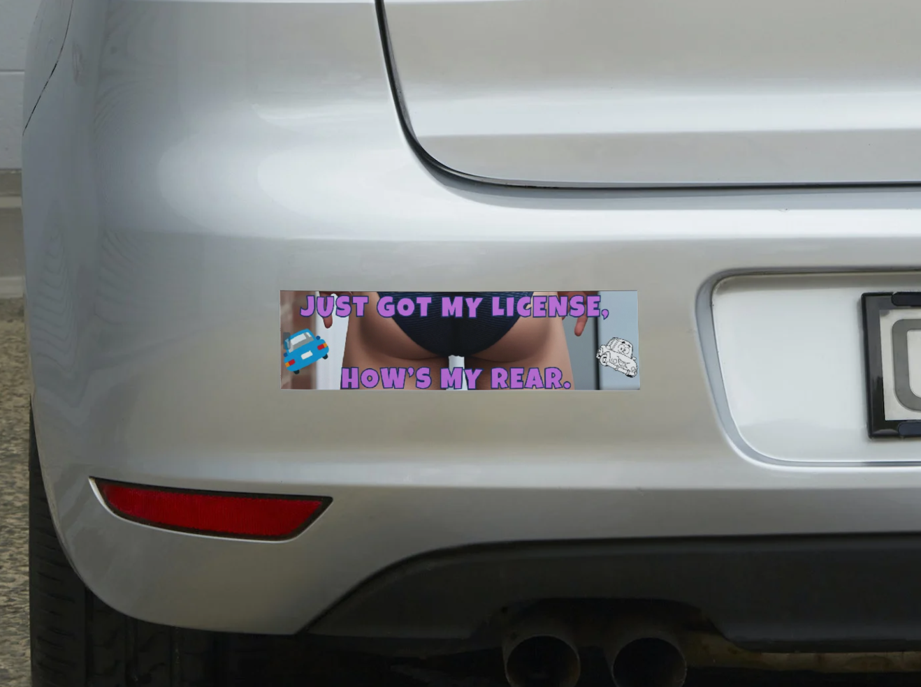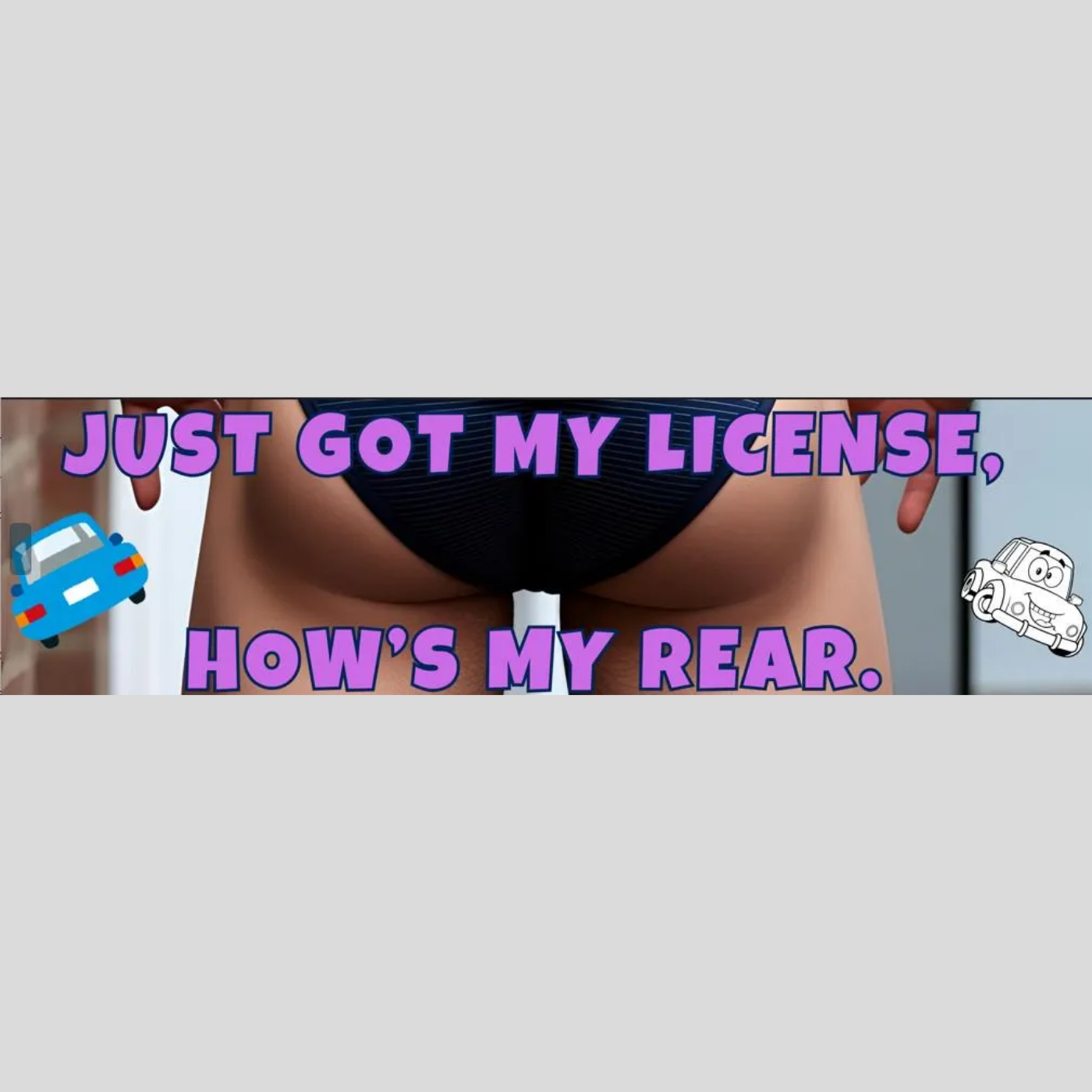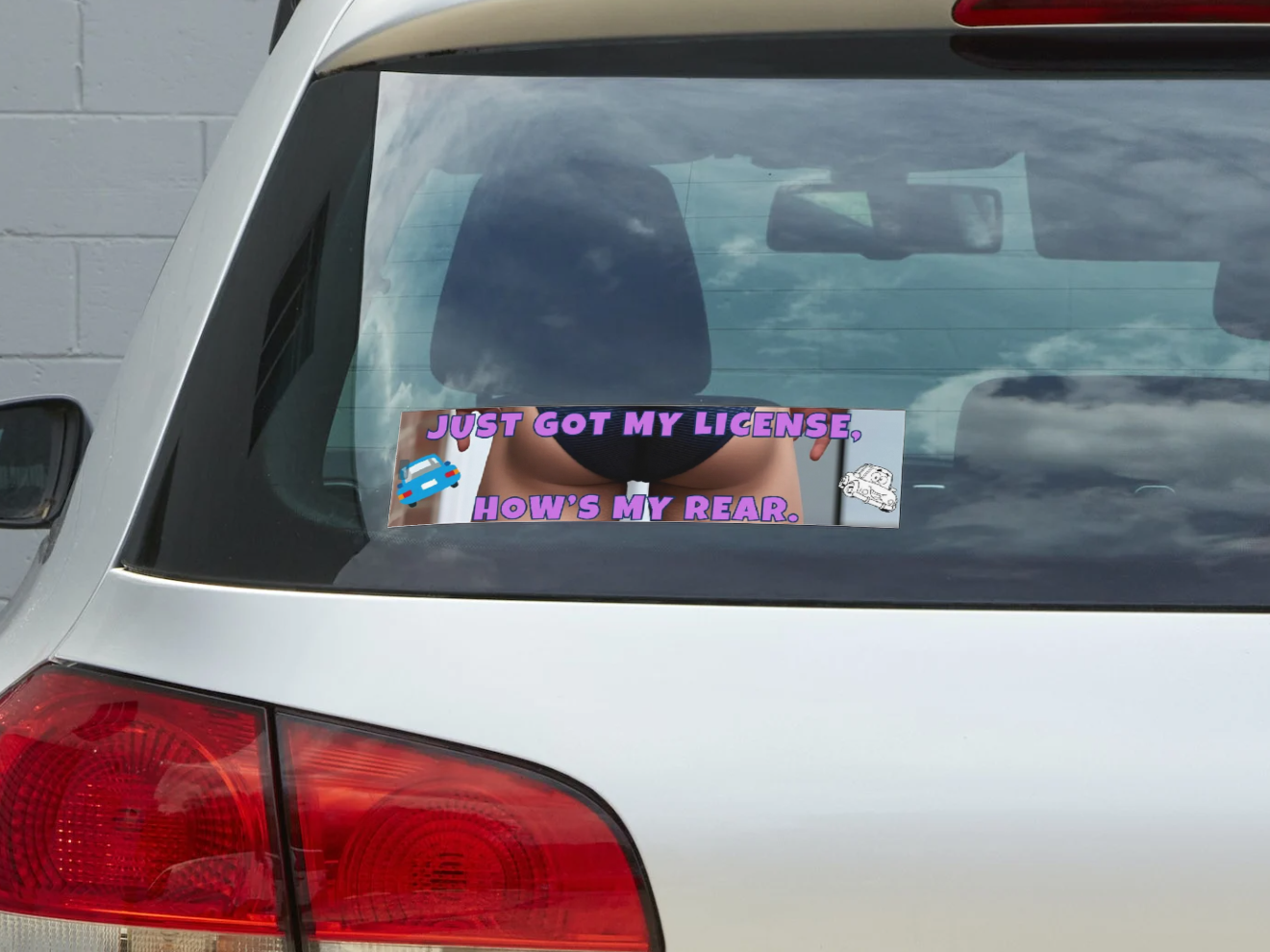 Funny New Driver Bumper Sticker 4 – "Just Got My License, How's My Rear?" – Teen Driver Gift, Car Decal, Graduation Humor Sticker