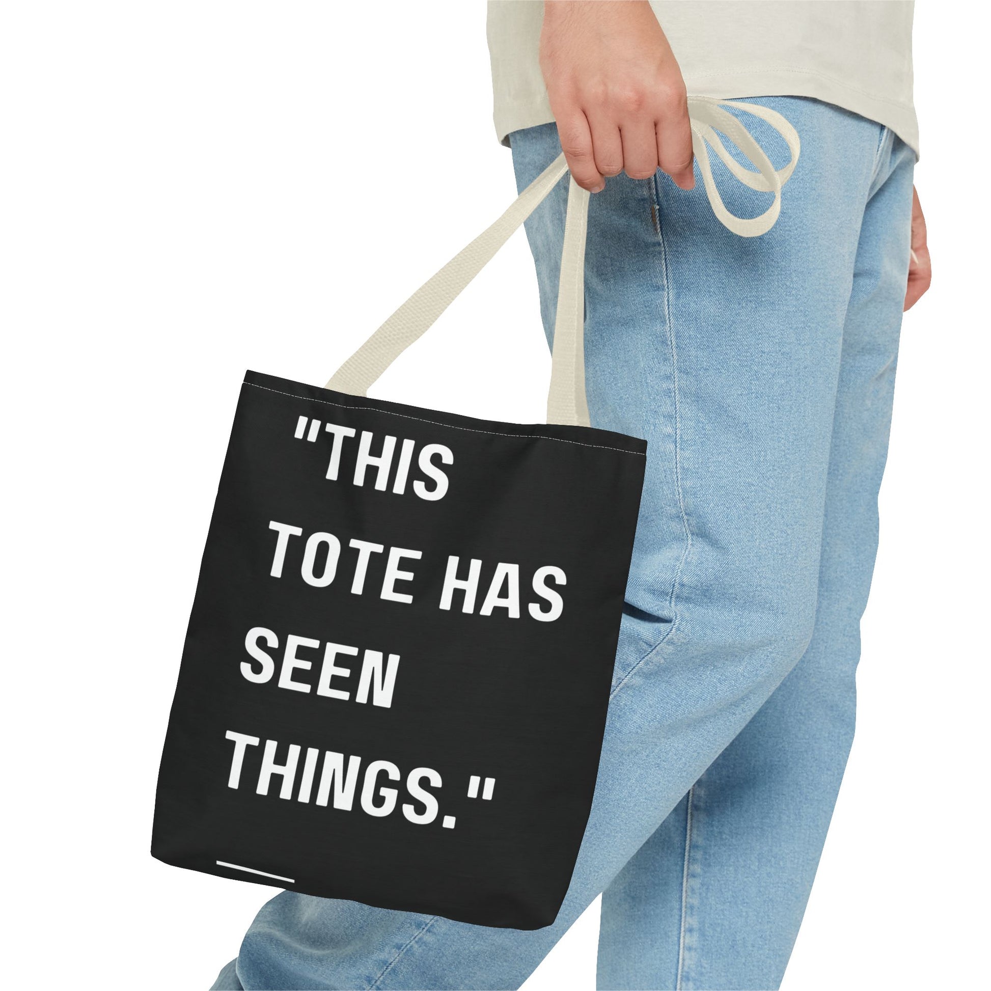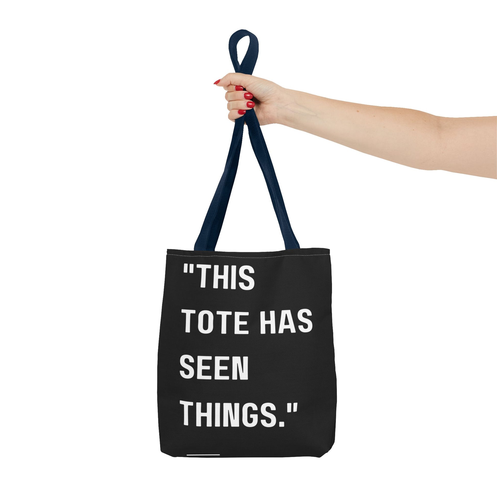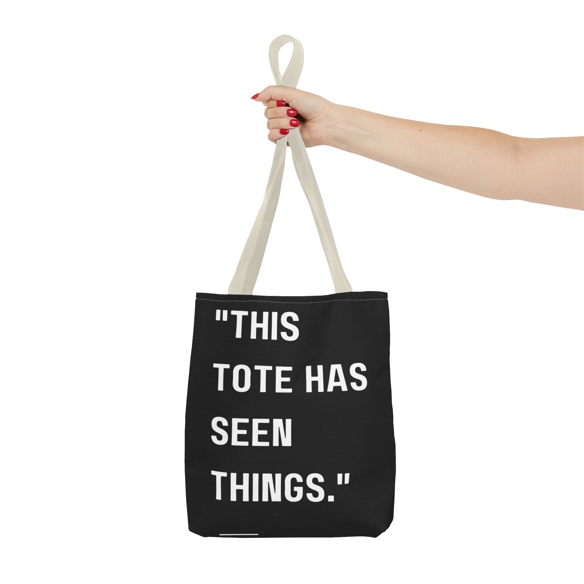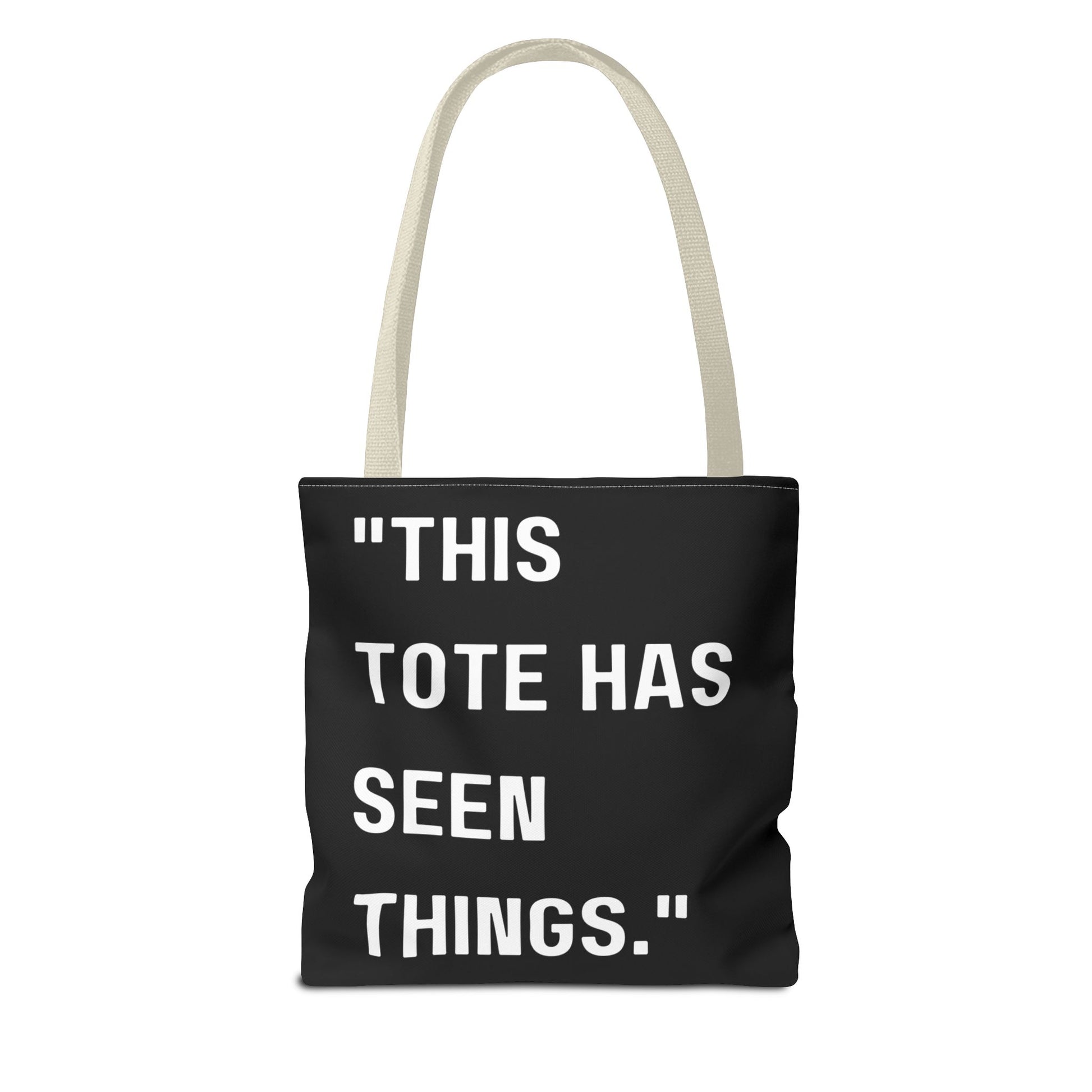 This stylish tote bag is a must-have accessory for anyone on the go. Crafted from durable 100% polyester, it combines strength with a chic design that speaks volumes—"This Tote Has Seen Things." Perfect for carrying your daily essentials, from groceries to beach gear, it adds a playful touch to your errands while keeping you organized. Whether heading to a weekend market, a day at the gym, or a casual outing, this tote is both practical and fun. Great for students, working professionals, or anyone who appreciates humor in their day-to-day life. This tote makes an ideal gift for birthdays, holidays, or just because—perfect for the quirky friend who loves to stand out!
