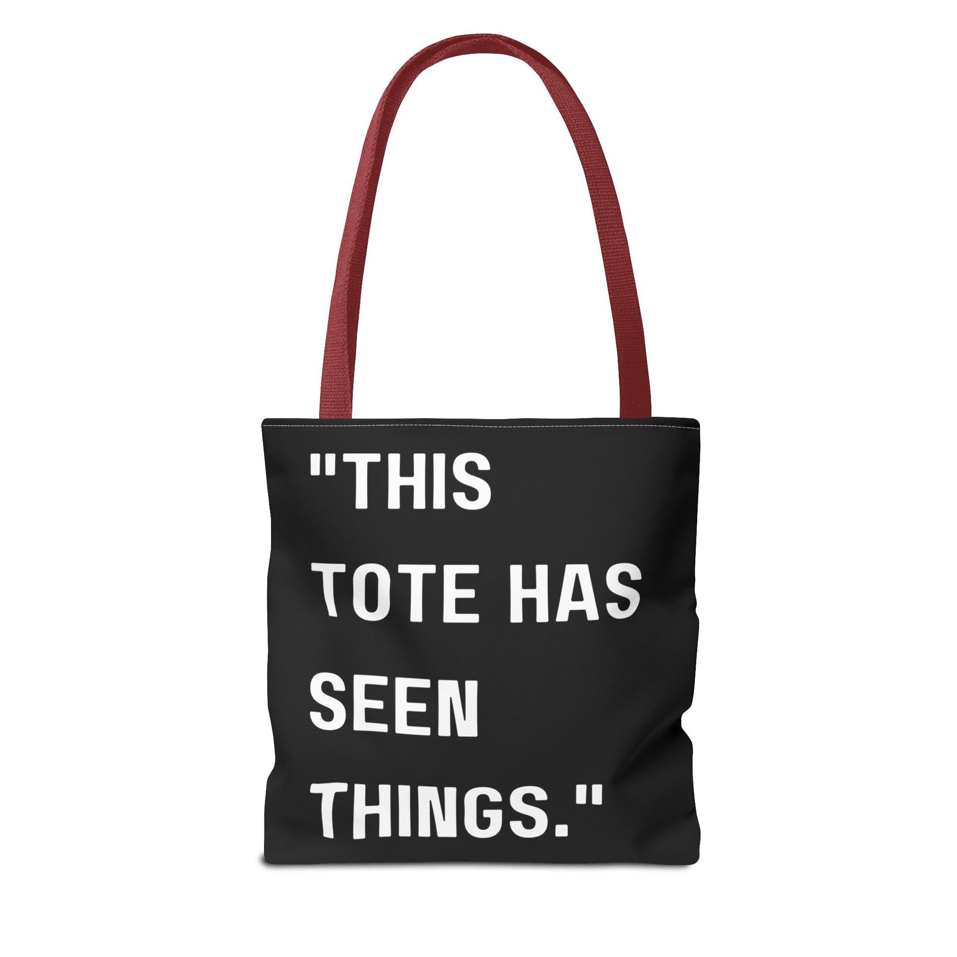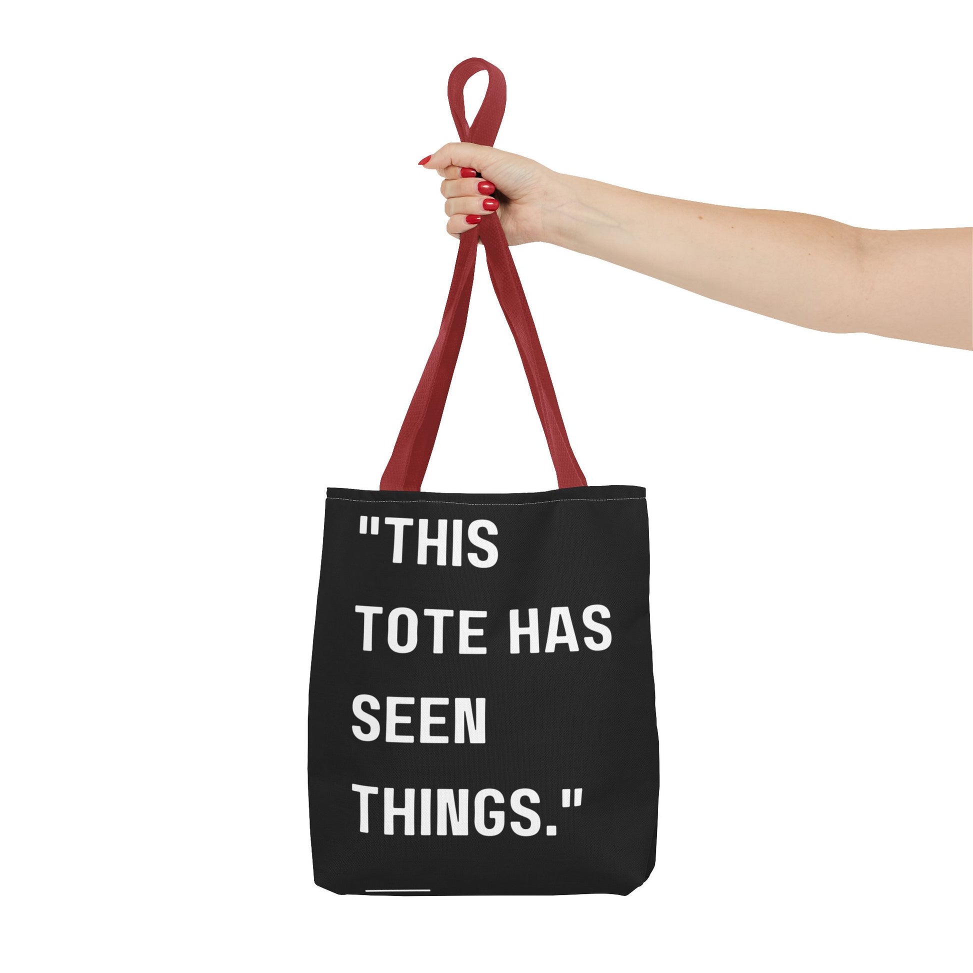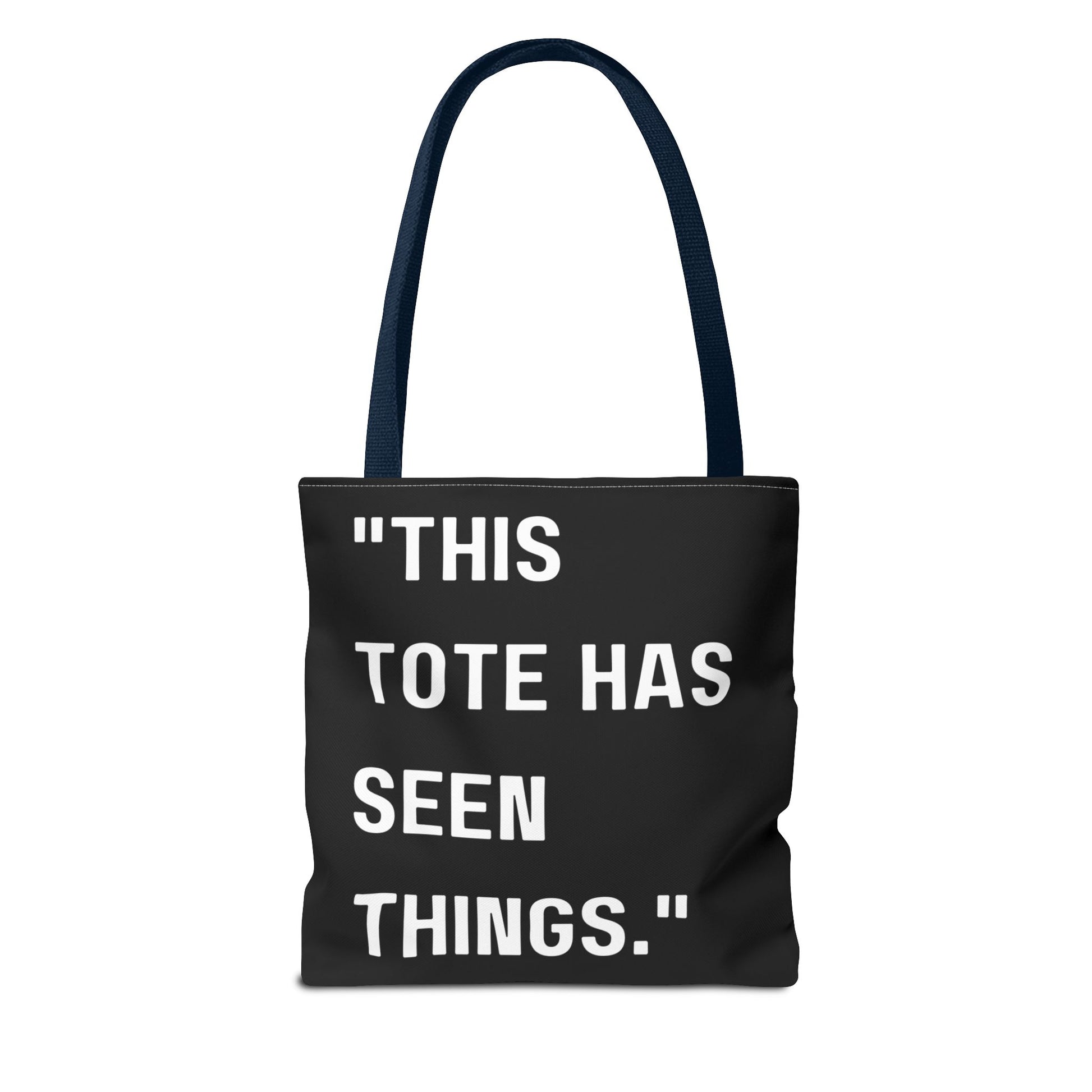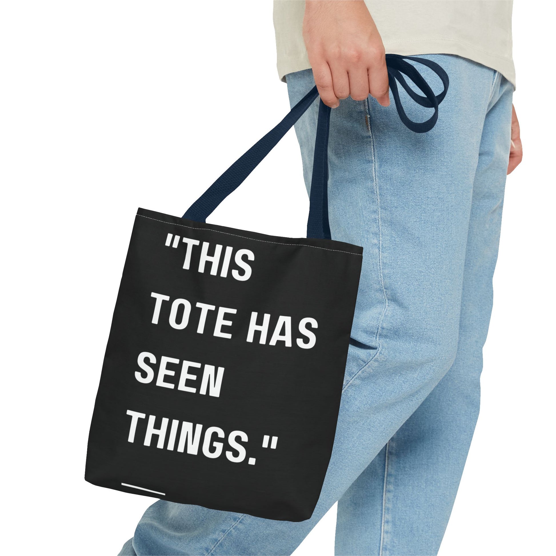 This stylish tote bag is a must-have accessory for anyone on the go. Crafted from durable 100% polyester, it combines strength with a chic design that speaks volumes—"This Tote Has Seen Things." Perfect for carrying your daily essentials, from groceries to beach gear, it adds a playful touch to your errands while keeping you organized. Whether heading to a weekend market, a day at the gym, or a casual outing, this tote is both practical and fun. Great for students, working professionals, or anyone who appreciates humor in their day-to-day life. This tote makes an ideal gift for birthdays, holidays, or just because—perfect for the quirky friend who loves to stand out!